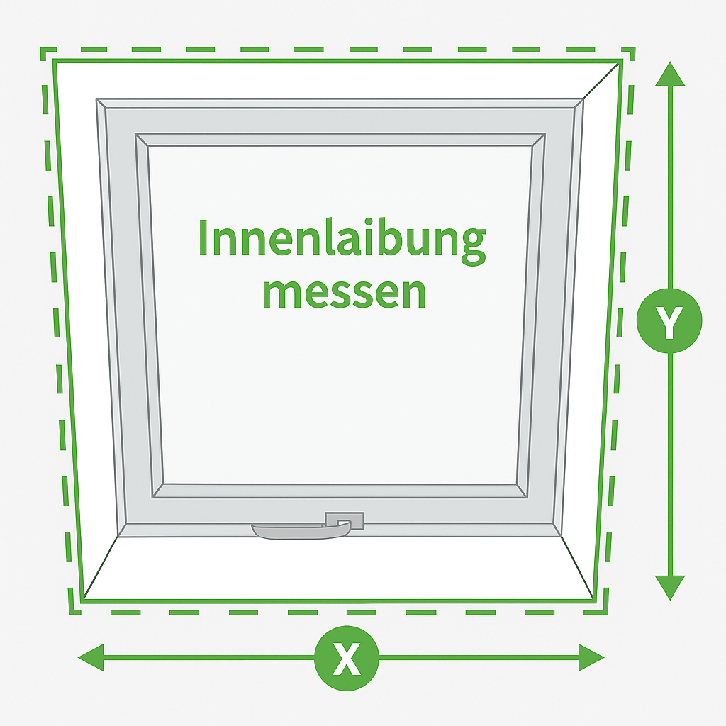 Gemessen wird die lichte Öffnung der Innenlaibung (nicht der Fensterflügel). Messen Sie Breite und Höhe an mehreren Punkten und verwenden Sie den kleinsten Wert in Millimetern. Bei schrägen oder unregelmäßigen Laibungen ist ein Foto besonders sinnvoll.