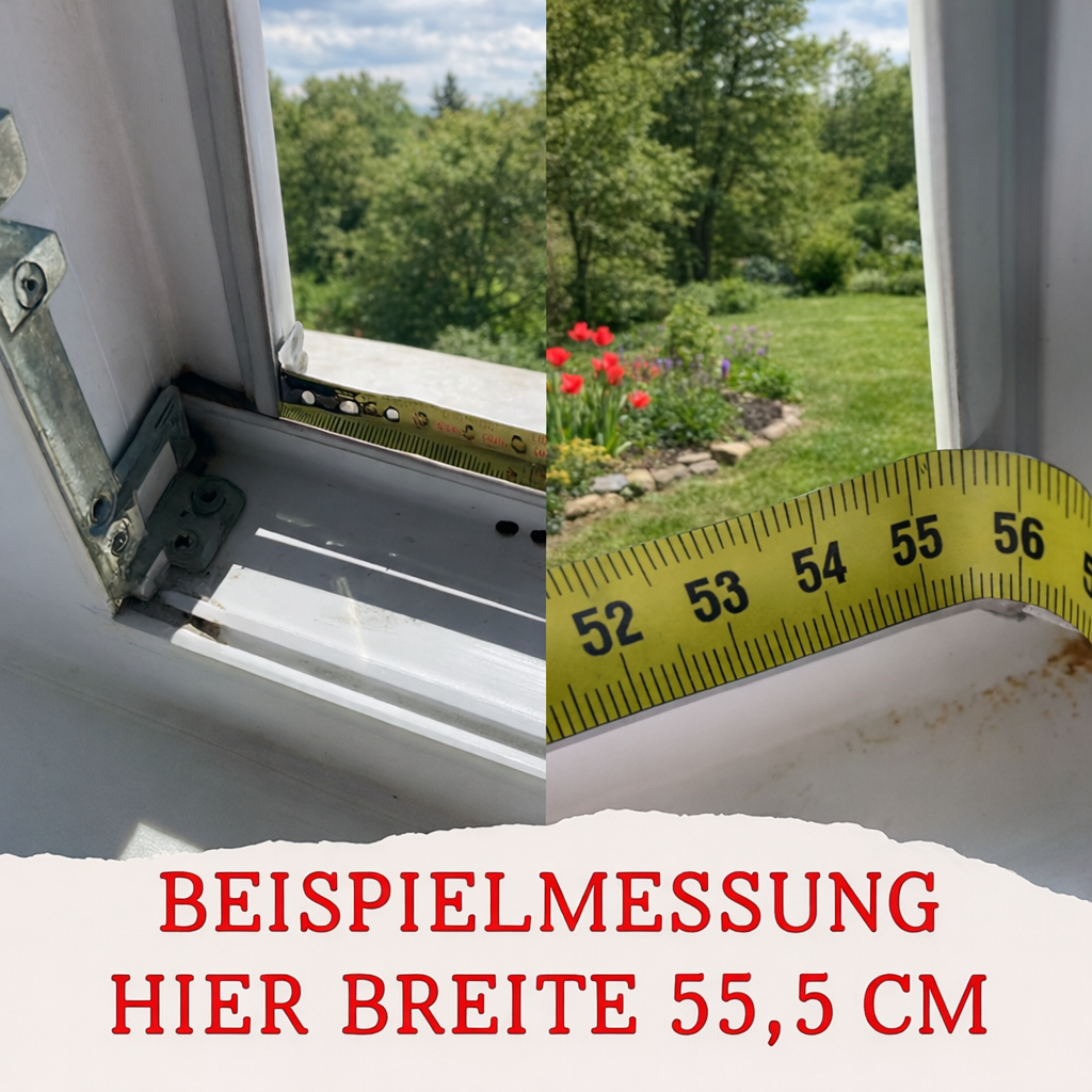 Messen Sie immer „innen–innen“ im Rahmen, bei Dachfenstern ggf. die Laibung innen.